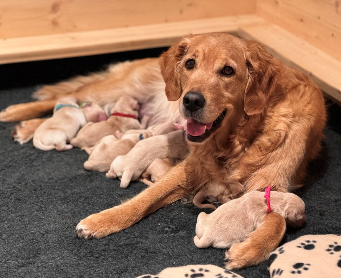 Pünktlich und zum Jahresende hat uns Dana am 30. Dezember 2023 9 kleine Wunder geschenkt. Instinktsicher und in einer Ruhe hat sie die 2 Rüden und die 7 Hündinnen geworfen. Jede Geburt ist anders und wir sind sehr dankbar, dass es allen gut geht. Dana sorgt sich liebevoll um die Kleinen und verlässt die Wurfbox jeweils nur ganz kurz. Jede Geburt ist wieder anders und es ist schön, wenn man diese tolle Erfahrung mit wertvollen und zuverlässigen Helfern teilen kann. Danke Bea, Ruth und Sandra - schön, dass wir dieses Erlebnis zusammen teilen konnten. Ein grosses Dankeschön möchte ich auch Carmen und Andreas Sellmer aussprechen, die uns Enrico als Deckrüde erneut anvertraut haben. Wir freuen uns auf die bevorstehenden Wochen und sind gespannt, wie sich die Kleinen entwickeln werden.